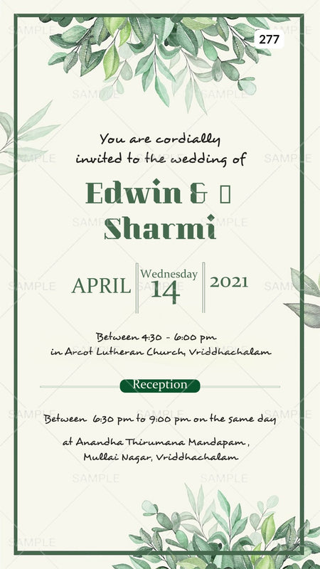 The Floral Theme of the Hindu south indian digital invitation Canva Editable for a wedding ceremony in the Green background color. This e-invite editable template is perfectly suitable for a Tamil family and it's available in the English language. It includes elements such as Green leaves and, a green frame. This card design can be customized online for free in Canva, and you can edit the couple's name, function name, date, time, venue, and regards. You can also share your card easily via WhatsApp or email.