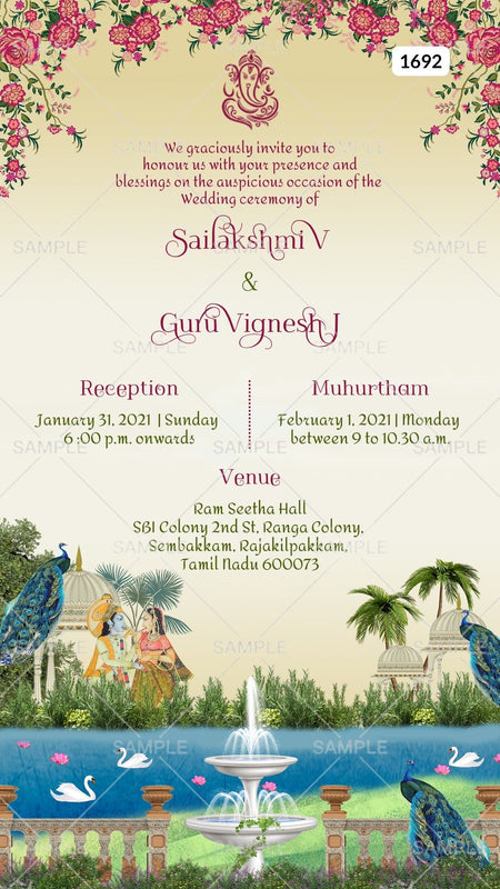 The garden Theme of the Hindu south indian digital invitation Canva Editable Template for a wedding ceremony in the yellow background color. This e-invite editable template is perfectly suitable for a Tamil family and it's available in the English language. It includes elements such as the Ganesha logo, pink flowers, peacock, Radha Krishna image, coconut tree, temple arch, lotus, duck, water, grass, fence, and fountain. This card design can be customized online for free in Canva, and you can edit the couple's name, function name, date, time, venue, and regards. You can also share your card easily via WhatsApp or email.