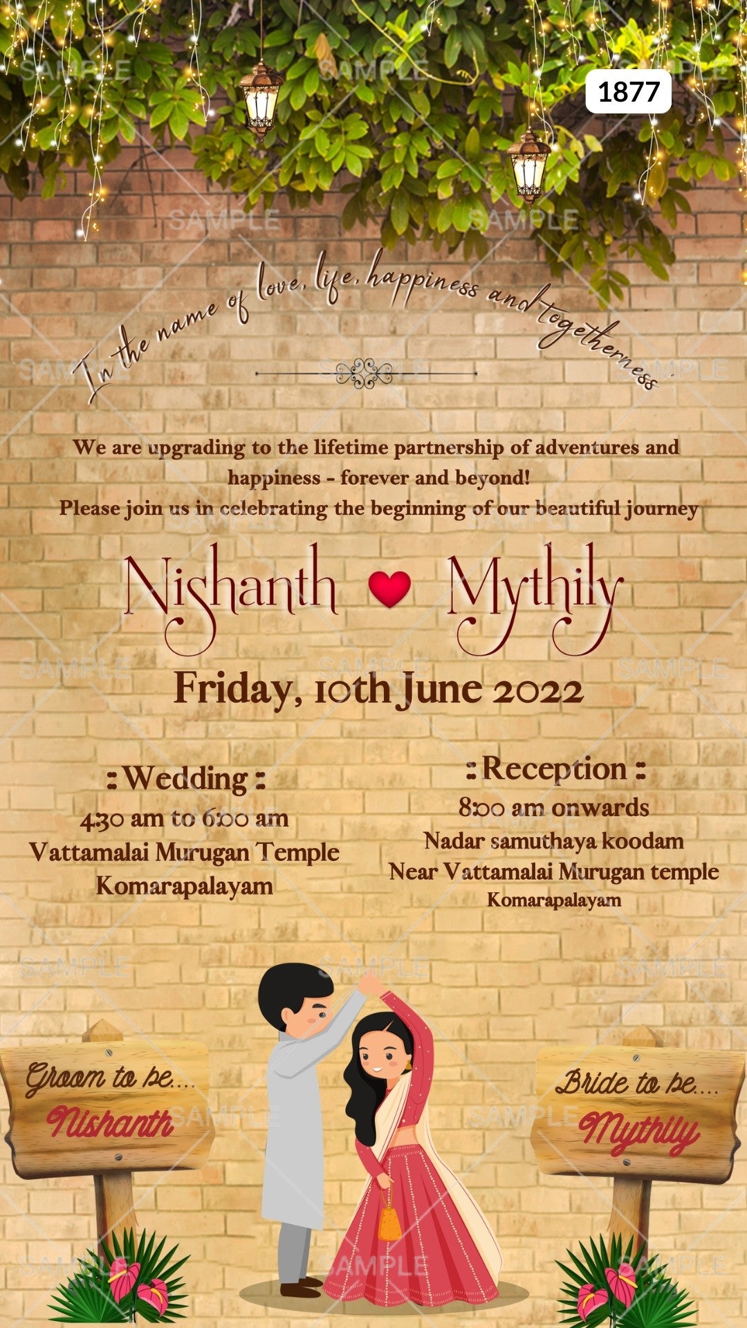 The vintage Theme of the Hindu south indian digital invitation Canva Editable Template for a wedding ceremony in brown wall background color. This e-invite editable template is perfectly suitable for a Tamil family and it's available in the English language. It includes elements such as a wooden board, pink leaves, a lantern, green leaves, string lights, couple doodle. This card design can be customized online for free in Canva, and you can edit the couple's name, function name, date, time, venue, and regards. You can also share your card easily via WhatsApp or email.