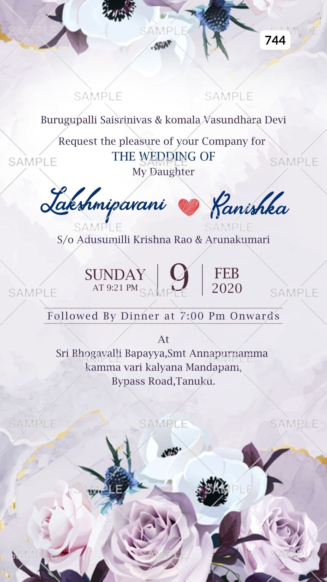 Wedding ceremony invitation card Canva Editable Template of hindu south indian telugu family in english language with Artistic flowers theme design 744