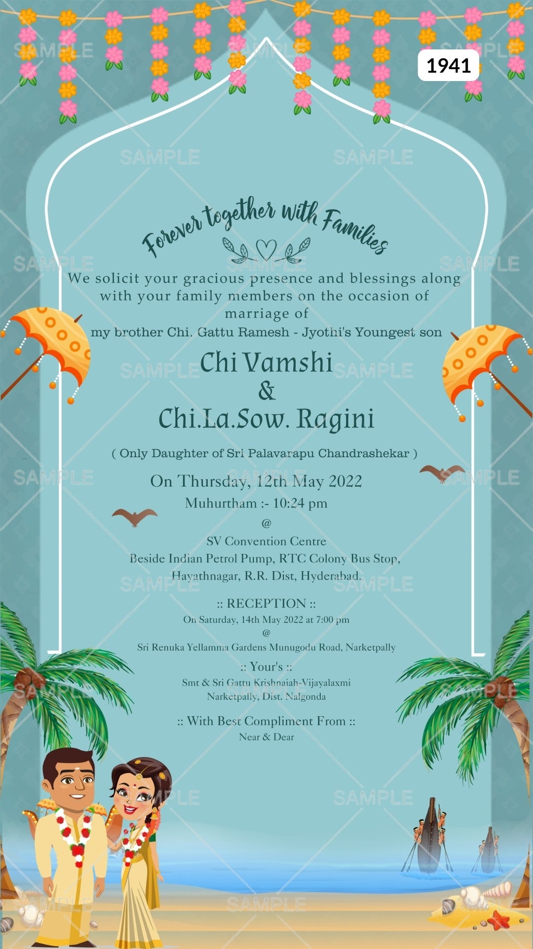 Wedding ceremony invitation card Canva Editable Template of hindu south indian telugu family in english language with beach theme design 1941