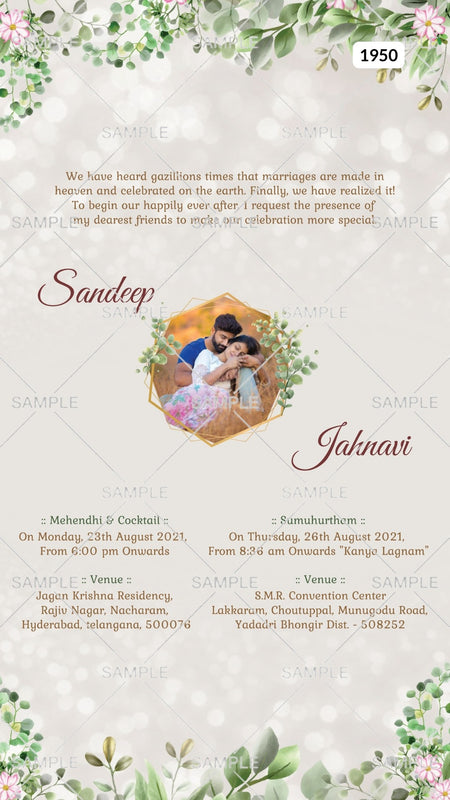 The couple's photo leaves the Theme of the Hindu south indian digital invitation Canva Editable Template for a wedding ceremony in the cream background color. This e-invite editable template is perfectly suitable for the Telugu family and it's available in English language. It includes elements such as couple photo, golden frame, green leaves, white glitter, and pink flowers. This card design can be customized online for free in Canva, and you can edit the couple's name, function name, date, time, venue, and regards. You can also share your card easily via WhatsApp or email.