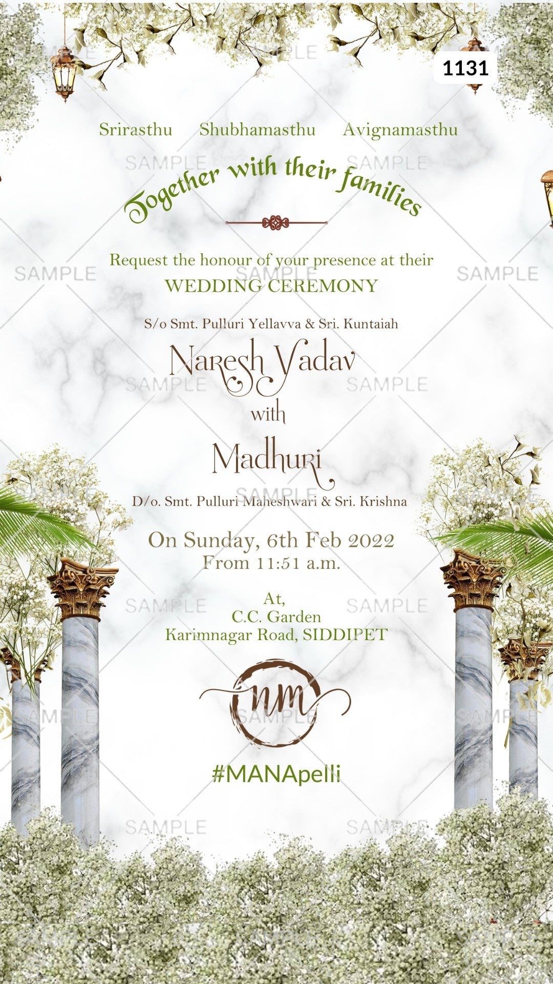 Wedding ceremony invitation card Canva Editable Template of hindu south indian telugu family in english language with floral theme design 1131