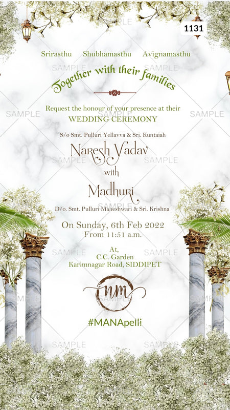The floral Theme of the Hindu south indian digital invitation Canva Editable for a wedding ceremony is a grey textured background color. This e-invite editable template is perfectly suitable for the Telugu family and it's available in English language. It includes elements such as a couple logo, lantern, grey pillars, and leaves. This card design can be customized online for free in Canva, and you can edit the couple's name, function name, date, time, venue, and regards. You can also share your card easily via WhatsApp or email.