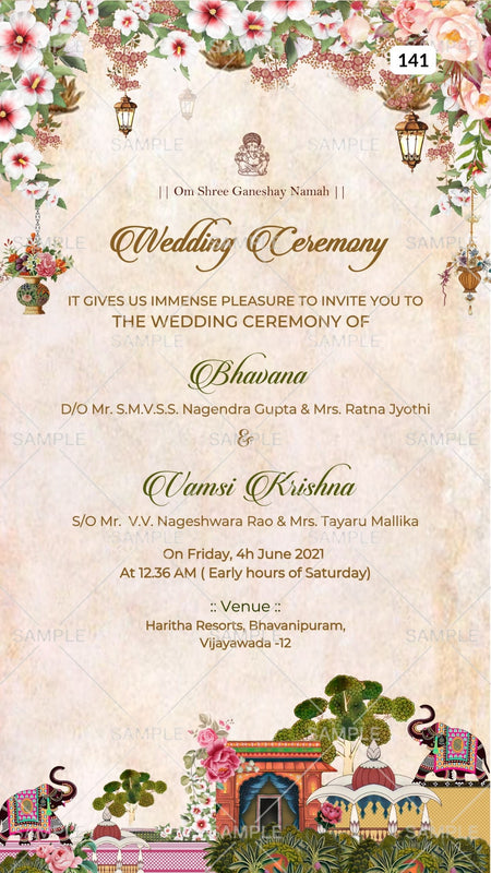 Wedding ceremony invitation card Canva Editable Template of hindu south indian telugu family in english language with floral theme design 141