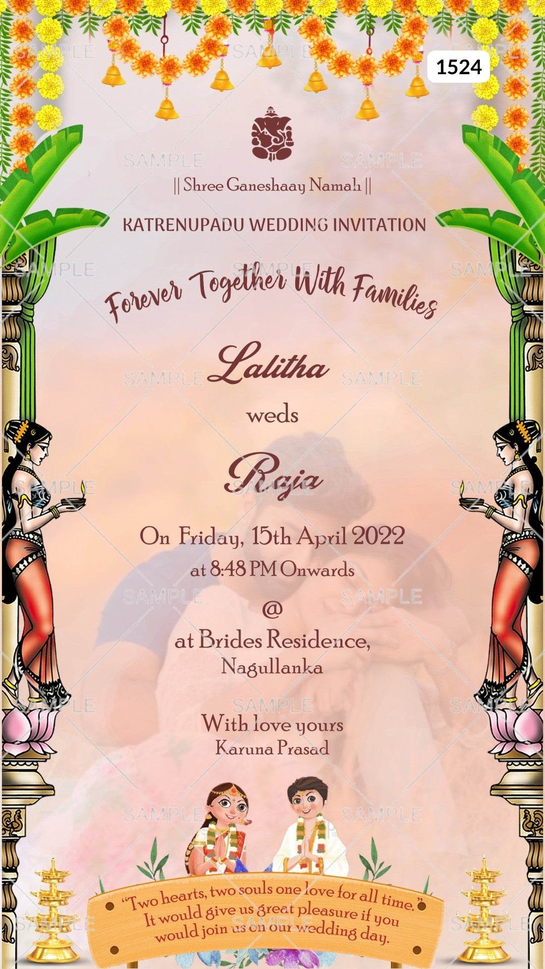Wedding ceremony invitation card Canva Editable Template of hindu south indian telugu family in english language with traditional theme design 1524