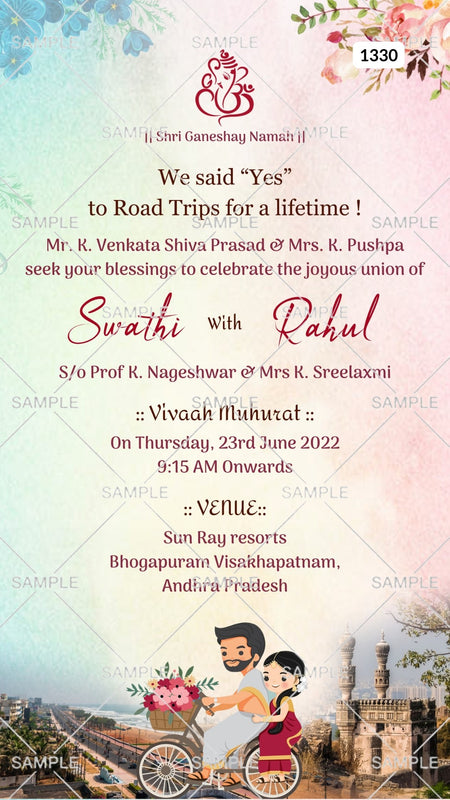 The two-state romantic Theme of the Hindu south indian digital invitation Canva Editable Template for a wedding ceremony in the pink, blue, and yellow pastel background color. This e-invite editable template is perfectly suitable for the Telugu family and it's available in English language. It includes elements such as a bicycle, couple doodle, pink flowers, red flowers, the Ganesha logo, blue flowers, and leaves. This card design can be customized online for free in Canva, and you can edit the couple's name, function name, date, time, venue, and regards. You can also share your card easily via WhatsApp or email.