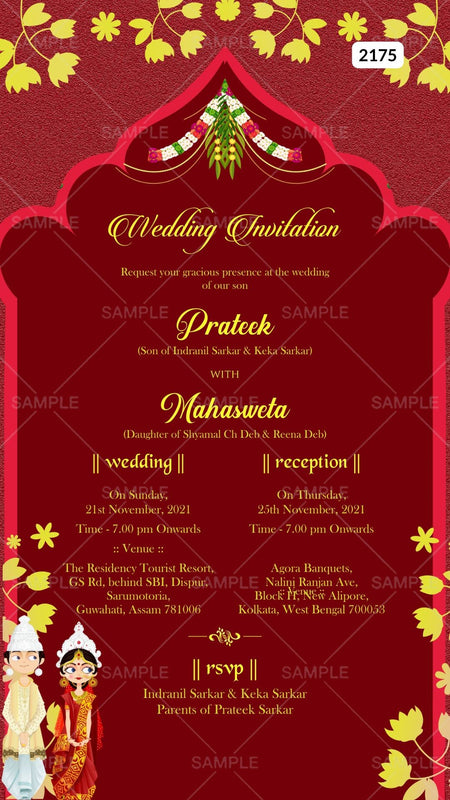 Wedding ceremony invitation card of hindu west bengal bengali family in english language with traditional theme Canva Editable Template design 2175