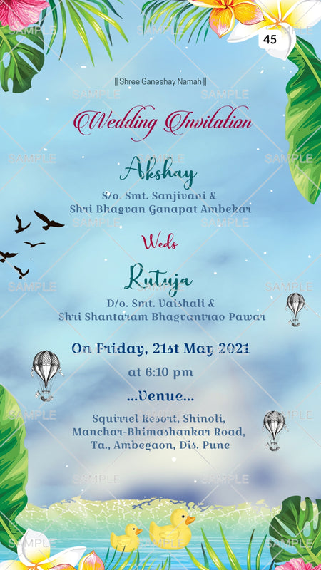 The River Theme of the Hindu Maharashtrian digital invitation Canva Editable for a wedding ceremony is in a Sky blue background color. This e-invite editable template is perfectly suitable for the Marathi family and it's available in English language. It includes elements such as Birds, green leaves, duck, parashoot, white flowers, pink flowers, and water. This card design can be customized online for free in Canva, and you can edit the couple's name, function name, date, time, venue, and regards. You can also share your card easily via WhatsApp or email.