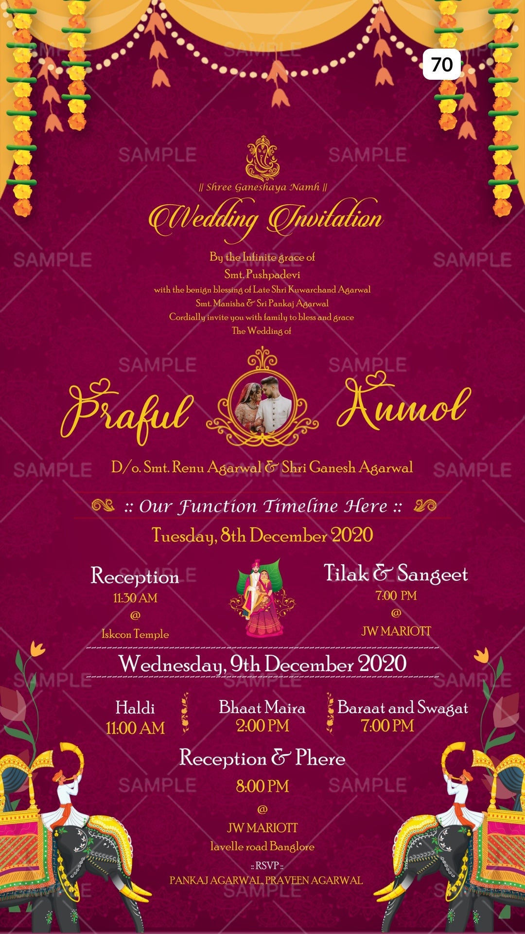 Wedding ceremony invitation card of hindu south indian kannada family in english language with Vintage theme Canva Editable Template design 70