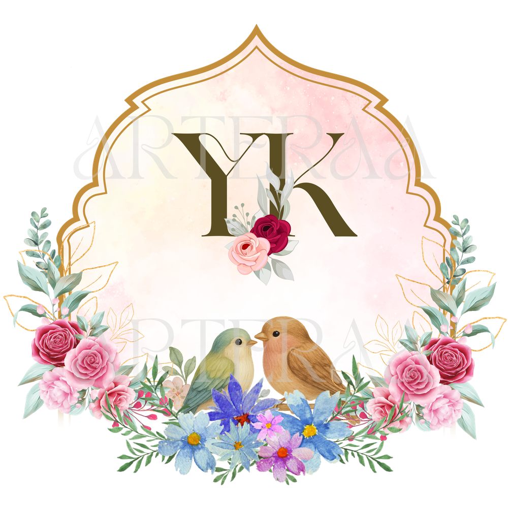 A: You will receive 5 high-resolution PNG files with transparent backgrounds featuring the selected couple initials (e.g., YK). The files are ready to use in digital or printed wedding materials.