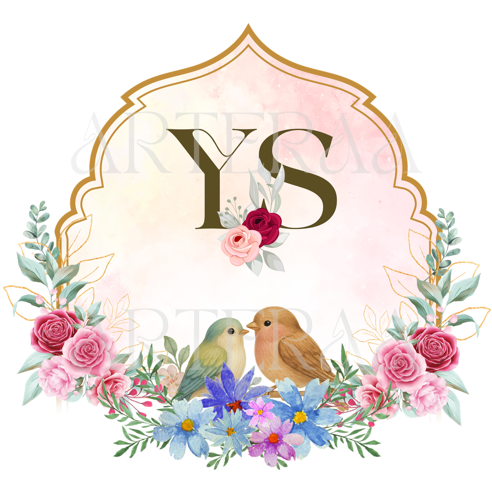 A: You will receive 5 high-resolution PNG files with transparent backgrounds featuring the selected couple initials (e.g., YS). The files are ready to use in digital or printed wedding materials.