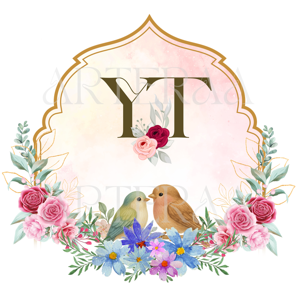A: You will receive 5 high-resolution PNG files with transparent backgrounds featuring the selected couple initials (e.g., YT). The files are ready to use in digital or printed wedding materials.