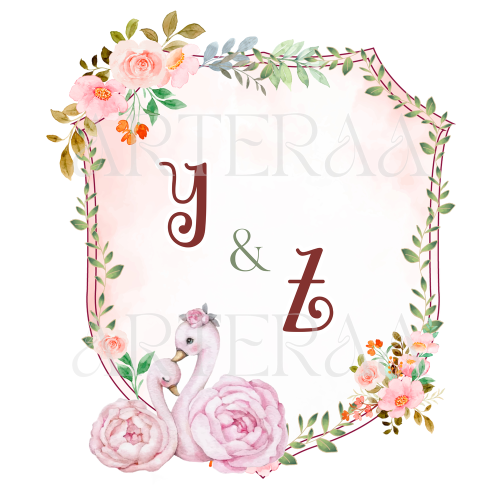 Floral Swan Monogram – Gentle pastel pinks, floral frame, and a pair of swans for an elegant romantic vibe.