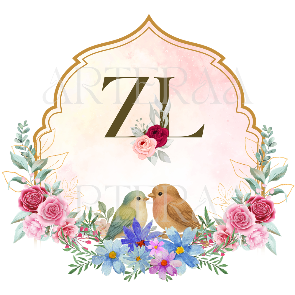 A: You will receive 5 high-resolution PNG files with transparent backgrounds featuring the selected couple initials (e.g., ZL). The files are ready to use in digital or printed wedding materials.