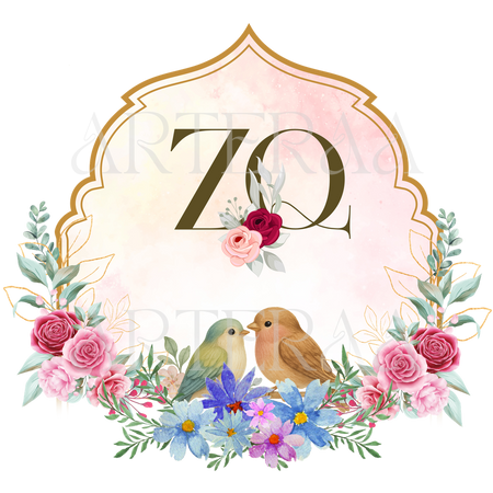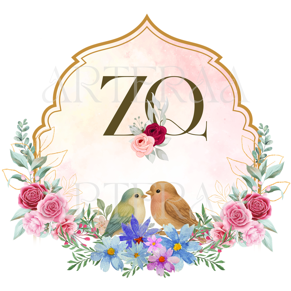 A: You will receive 5 high-resolution PNG files with transparent backgrounds featuring the selected couple initials (e.g., ZQ). The files are ready to use in digital or printed wedding materials.