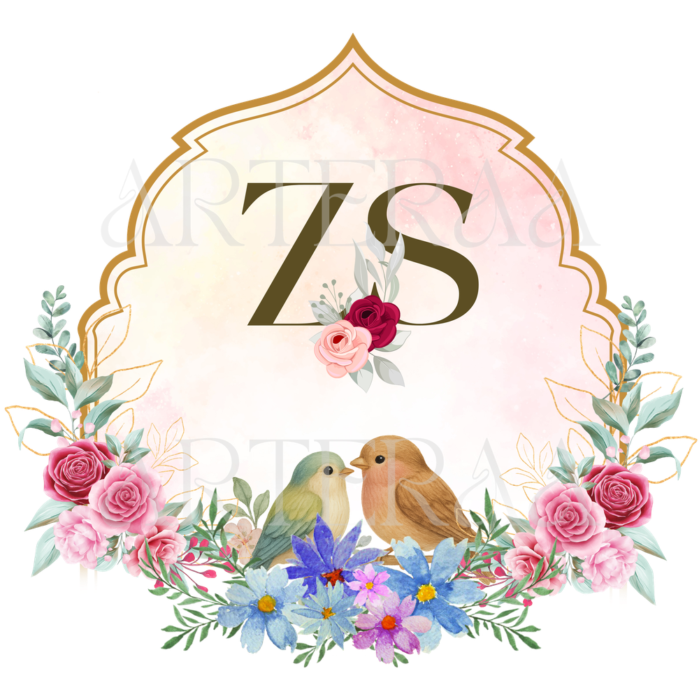 A: You will receive 5 high-resolution PNG files with transparent backgrounds featuring the selected couple initials (e.g., ZS). The files are ready to use in digital or printed wedding materials.